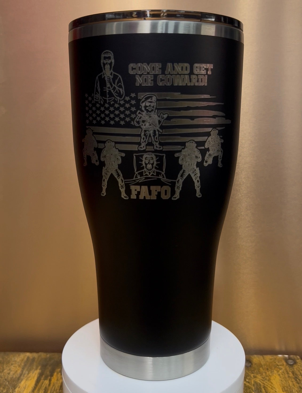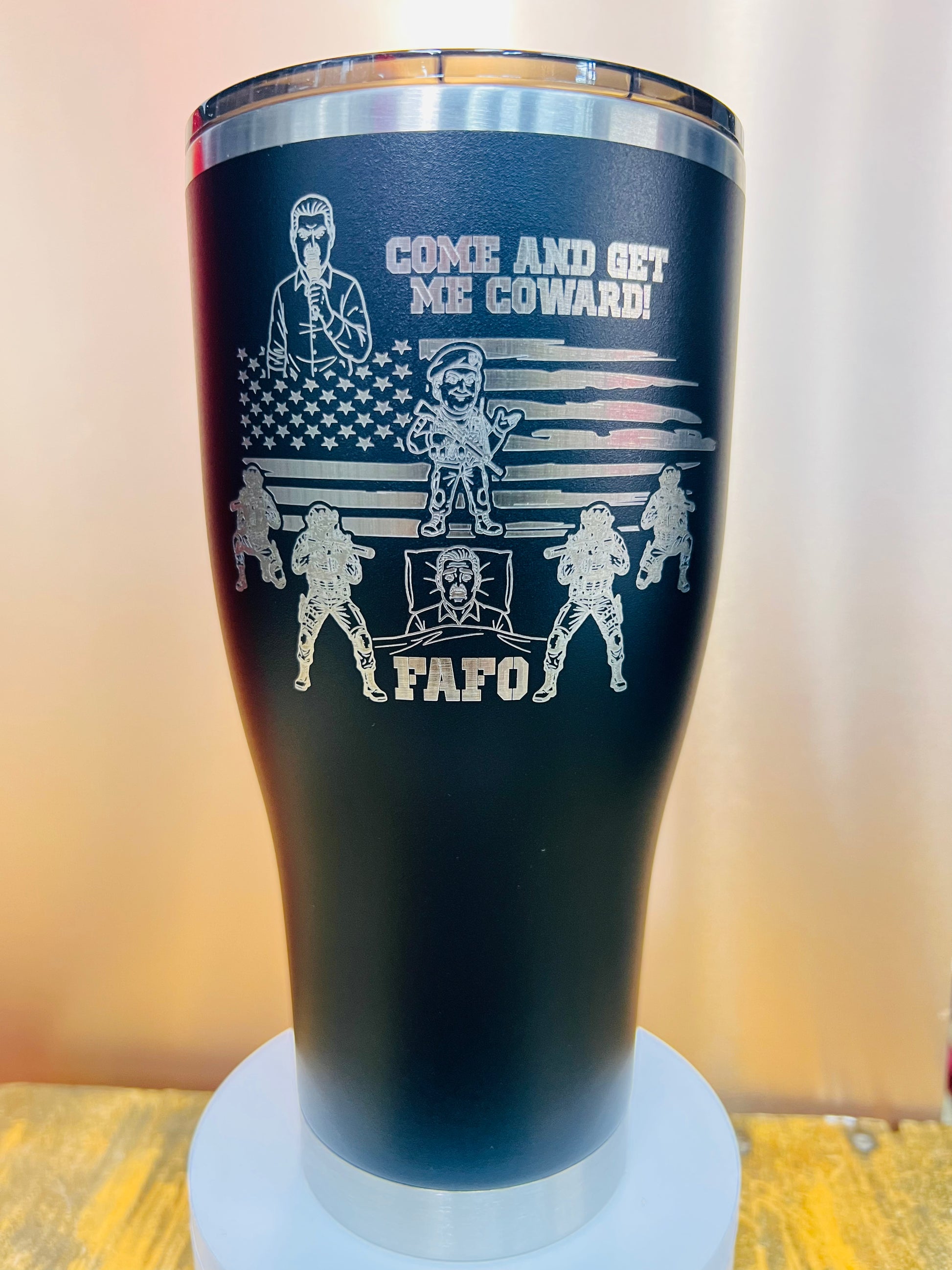 Sunglasses-wearing Trump silhouette proclaims "Come and Get Me Coward!" above flag-draped special forces dragging Maduro from his palace, with "FAFO" etched prominently below for that viral meme edge. Precision laser engraving ensures fade-proof detail on the premium powder coat.