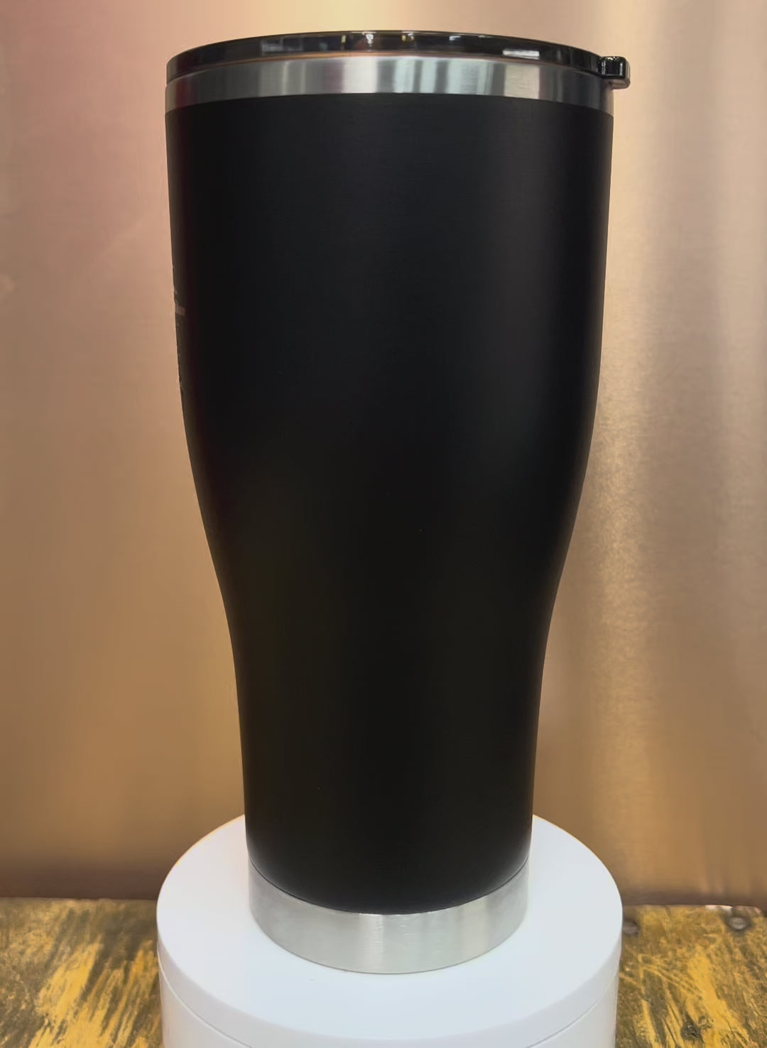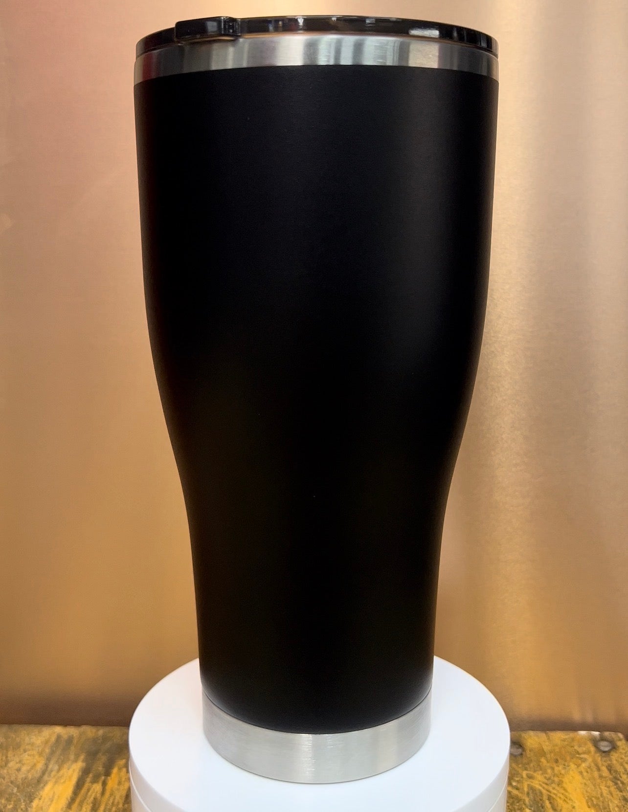 Holds 30oz of liquid with 18/8 food-grade 304 stainless steel double-wall vacuum insulation—keeps drinks cold up to 24 hours or hot up to 12 hours. Features a tapered modern curve design (fits standard cup holders), durable matte black powder-coated exterior (scratch- and sweat-resistant), BPA-free clear lid with silicone seal and slider, reusable straw, and individually boxed packaging.